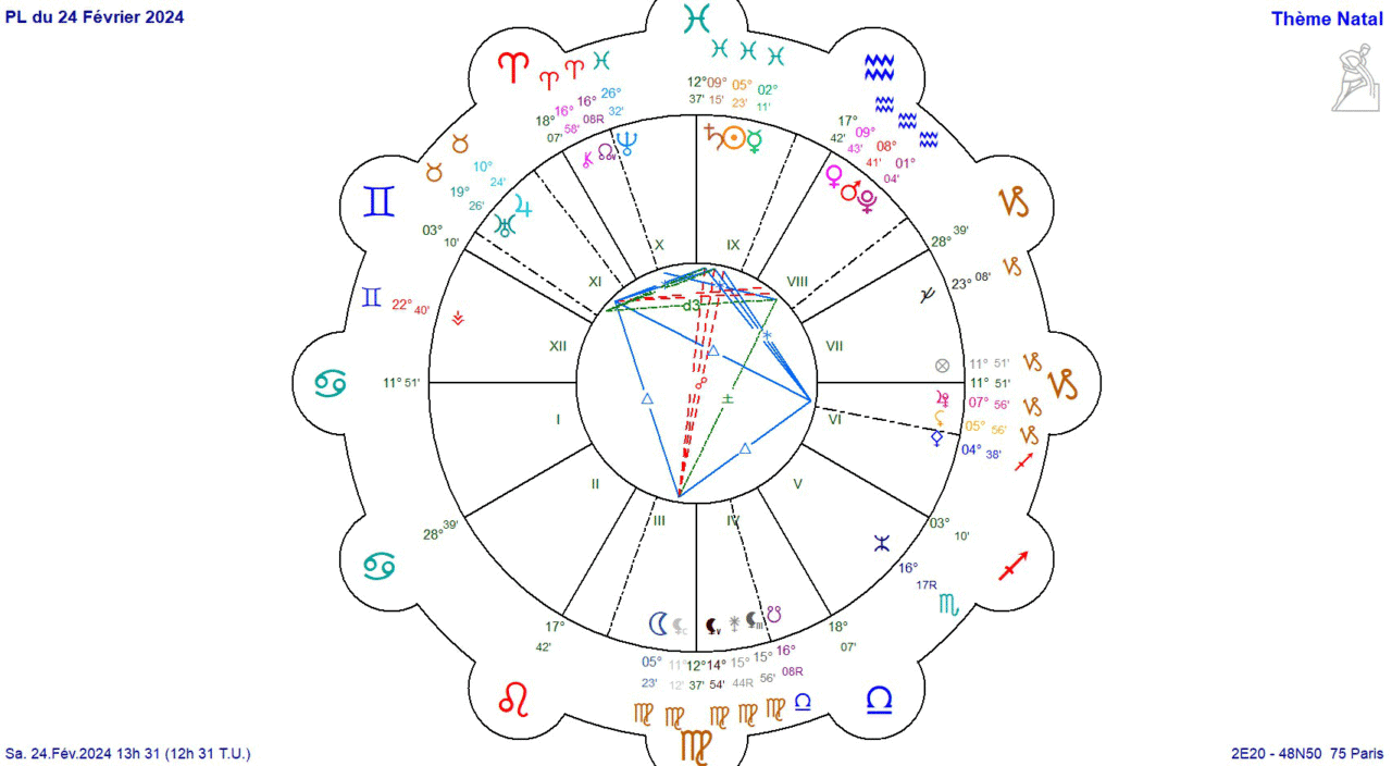 Le Soleil en Poissons à 5°23, la Lune diamétralement opposée à 5°23 en Vierge.
